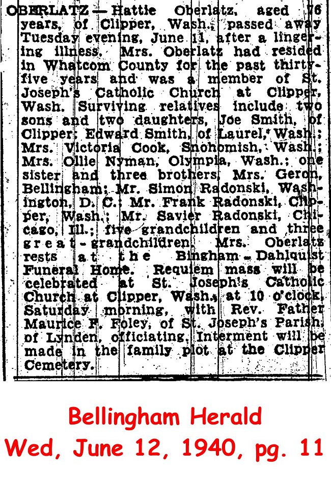 OBERLATZ, Robert Joseph, age 62 years, who resided at 2019 Iron St., passed away at the family residence Saturday, Feb. 4th, (1956) following a heart attack. Mr. Oberlatz had resided in Bellingham his entire lifetime. He was a member of the Church of the Assumption; Eagles Lodge Aerie No. 31, and an honorary member of Painters Union Local No. 924. He leaves to survive, his wife, Mrs. Edith M. Oberlatz; one sister, Mrs. Clara Durkin, of Bellingham; two brothers, Charles Oberlatz, Bellingham, and Harry Oberlatz, Oregon; also one niece, Mrs. Mary Hemminger, of Bellingham. The remains rest at the Bingham Dahlquist and Jerns Funeral Home, where Rosary will be recited in the Chapel on Monday, Feb. 6 at 7 p.m. Requiem High Mass will be celebrated in the Church of the Assumption Tuesday, Feb. 7 at 9:30 a.m. Final resting place Bayview Cemetery.