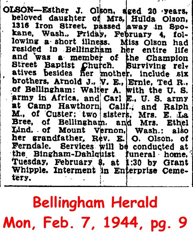 (From The Bellingham Herald, 4 Oct 2000) Submitted by Merrily Lawson.OLSON, Jennie, age 71 years, a resident of the Ferndale district for the past 43 years, passed away at her home in Ferndale, Friday evening, January 19, (1945). Mrs. Olson is survived by three daughters, Mrs. Al C. Guyor, Bellingham; Mrs. Charles Smith, Seattle, and Mrs. Charles Hovander, Lynden; three sons, H. R. Olson, Bellingham; Edwin L. Olson, Blaine; Albert Olson, Ferndale, and one brother, Claude Carlson, Bellingham; also six grandchildren and two great-grandchildren. Funeral services will be conducted from the Monroe Funeral Chapel in Ferndale, Tuesday, January 23, at 2 p.m. with Rev. A. H. Johnson officiating. Interment, Enterprise Cemetery.