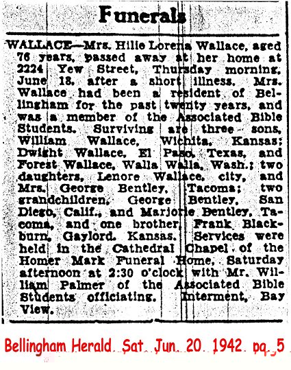 WALLACE, Lelia Pearl, aged years, passed away at a local hospital, Tuesday, July 1, (1941) following a long illness. Mrs. Wallace had resided here for the past thirty-eight years and was a member of the First Christian Church and the Royal Neighbors of America. Surviving relatives are the husband, John Wallace at home, 1400 Woburn Street; two sons, Robert W., at Mount Vernon, and Orville L., at Winslow, Wash; one daughter, Ruth Petrie at Seattle; three granddaughters, also one brother, William C. Tucker at Enumclaw. The remains are at the funeral home of Harlow-Hollingsworth where services will be conducted by the Rev. Ray S. Wagoner, Saturday, July 5, at 10:30 a.m. Final resting place, Bay View.