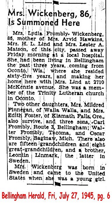 WALKER, Thomas Freeman, of Lynden, passed away Tuesday, September 4, (1945) at the age of 87 years. Mr. Walker had been a resident of Lynden for the past six years and was a member of the Woodmen of the World. He leaves to mourn, one son, Enoch P., of Lynden; one grandson, Kenneth Walker, and five great-grandchildren, all of Salem, Oregon. The remains are resting at the Gillies Funeral Home in Lynden and will be shipped to Salem, Oregon, where funeral services will be conducted Saturday, September 8.