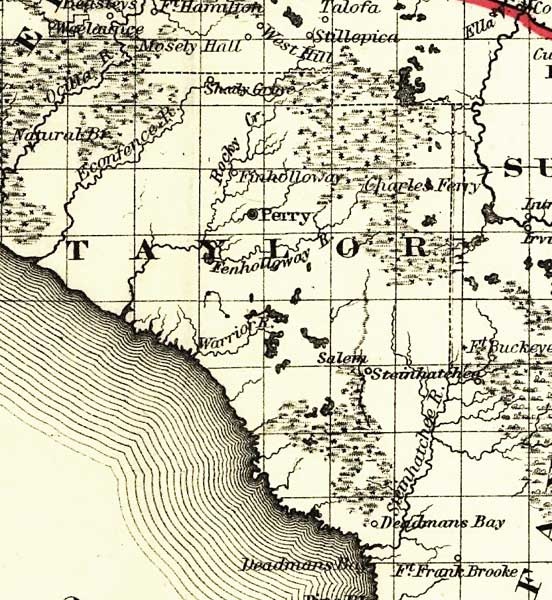 1880 Aucilla River, Moseley Hall, Econfina River, Shady Grove, Green Hill, Perry, Finholloway, Finholloway River, Spring Warrior, Warrior River, Salem, Steinhatch, Point Edward, Deadman's Bay