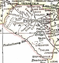 1916 Harmont, Redoak, Springfield, Moseley Hall, Iddo, Covington, Shady Grove, Lake Bird, Lancaster, Chancy, Boyd, Holmes, Simmons, Murat, Blue, Waylonzo, Loughridge, Perry, Hampton Springs, Cato, Townsend, Fenholloway, Pinland, Charlton, Athena, Salem, Aksold, Register, Thelma, Jonesboroo, Stephensville, Jena