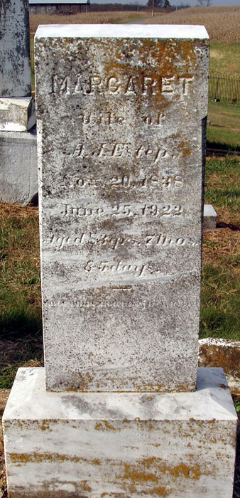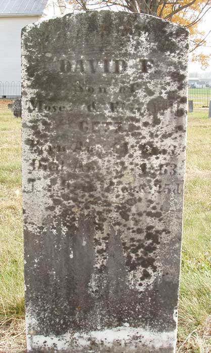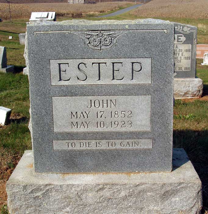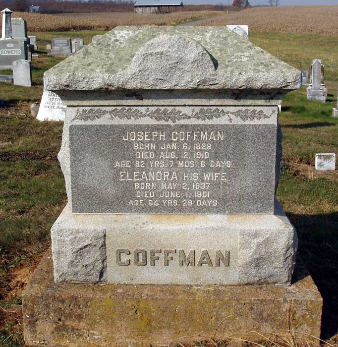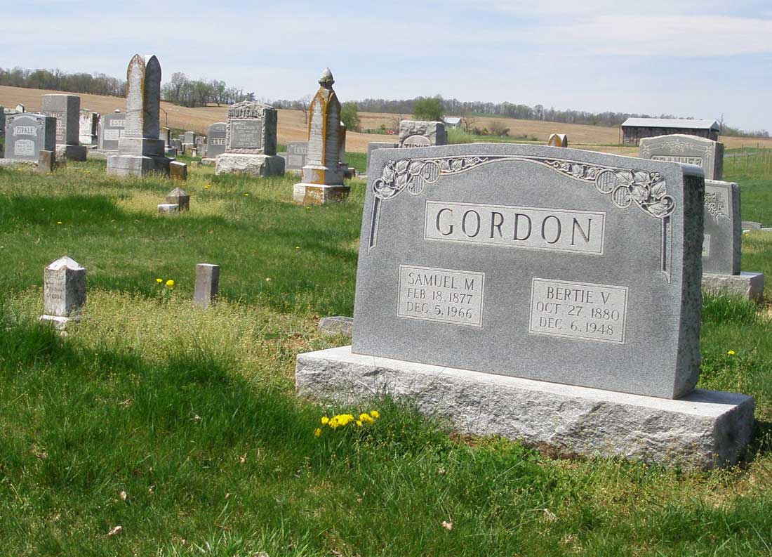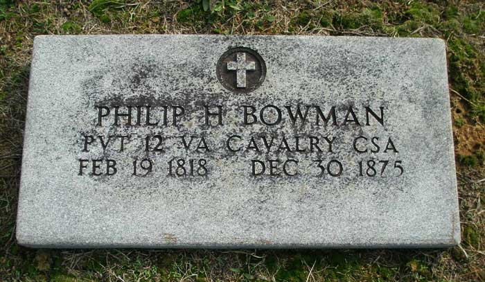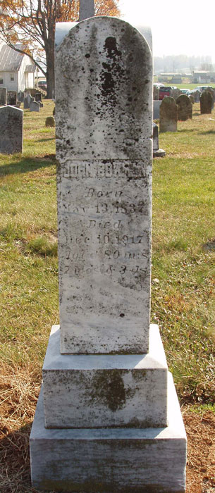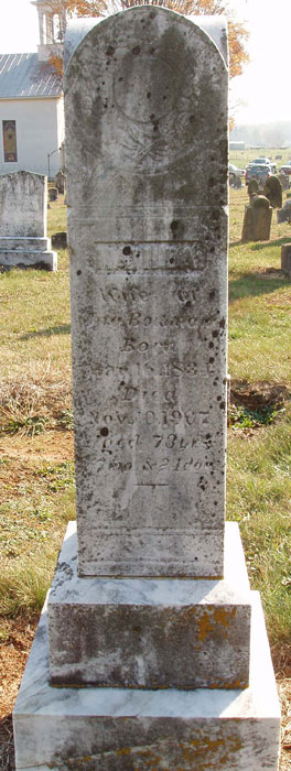 ?, Mary Ella; n.d. - 1841; Age 29 years Akers, Janice W.; 9 Nov 1932 - n.d.; Wife of T. Ray Akers, T. Ray; 19 Mar 1920 - 9 May 1977 Andrick, Casper M.; 19 Dec 1864 - 27 Mar 1920 Andrick, Mark R.; 6 Apr 1913 - 15 Aug 1914; Son of C. M. & N. A. Andrick, Virginia Loraine; 18 May 1902 - 20 Sep 1903; Daughter of C. M. & N. A. Andrick, William David; n.d. - 9 Sep 1887; Son of Samuel D. & Diana; Age 6.0.8 Armentrout, Andrew J.; 26 Nov 1874 - 19 Mar 1896; Son of Geo. E. & Mary A.; Age 21.3.22 Armentrout, Mary A.; 8 Nov 1837 - 19 Jul 1925; Wife of George E.; Age 87.8.11 Ashby, Cornelia F.; 24 Dec 1874 - 29 Aug 1931; Wife of H. Greely Ashby, H. Greely; 1 Jul 1872 - 1 May 1954 Auguste, George James; 2 Apr 1883 - 10 Feb 1966 Baker, Annie J.; 22 Jun 1873 - 21 Jan 1919; Wife of James F. Baker, Catherine Ryman; 1871 - 1943 Baker, Harold A.; 6 Mar 1890 - 31 Mar 1961; Photo contributed by Don Silvius Baker, Isabella; 1840 - 1911; Wife of Lewis D. Baker, Jacob; 11 Dec 1813 - 14 Feb 1874; Age 60.2.3 Baker, James F.; 23 Apr 1870 - 10 Jul 1934 Baker, Joseph; 30 Apr 1838 - 4 Jan 1902; Age 63.8.4 Baker, Lewis D.; 1837 - 1921; C.S.A. Co. E - D, 49th Va Infantry 1st Sgt. Baker, Lucinda; 14 Sep 1843 - 10 Nov 1890; Wife of Joseph; Age 47.1.26 Baker, Mary S.; 27 Aug 1880 - 13 Jul 1965; Wife of Harold A.; Photo contributed by Don Silvius Baker, Philip Thomas; 1 Aug 1870 - 9 Nov 1881; Son of Lewis D. & Isabel; Age 11.32.5 Barb, Jacob D.; 9 Dec 1832 - 30 Nov 1876; Age 43.11.21 Barb, Lucy A.; 5 Feb 1837 - 30 May 1909; Wife of Jacob D. Bauer, -; n.d. - 19 Apr 1814; Age 47.6.28 Bauer, Elizabeth; n.d. - 15 Mar 1815; Age 76.2.18 Bauer, Jeorg; n.d. - 4 Mar 1814; Age 49.0.17 Beedle, Annie S.; 21 Nov 1881 - 7 May 1935; Wife of Charles H. Beedle, Charles H.; 19 Mar 1885 - 23 Jan 1952 Beedle, Daughter; n.d. - 15 Mar 1918; Daughter of C.H. & A.S. Beedle, Florence E.; 7 May 1912 - 17 Jun 1913; Daughter of C.H. & A.S. Beedle, Nellie V.; 21 Feb 1909 - 8 Oct 1966; Daughter of Charles H. & Annie S. Biller, Braxton K.; 11 Apr 1881 - 10 May 1947 Biller, Charles L.; 9 Jan 1922 - 7 Jan 1926; Son of B.L. & Lydia Biller, Charles Luther; 29 Apr 1906 - 27 Oct 1981 Biller, Dorothy Marie; 12 Dec 1911 - Oct 1986; Wife of Charles Luther Biller, Elizabeth; 30 Jun 1868 - 15 Dec 1926; Wife of Joseph S.; Age 58.5.15 Biller, Emma L.; 1856 - 1935; Wife of Simon P. Biller, Georgianna; 9 Apr 1961 - 11 Nov 1929 Biller, Joseph S.; 31 Jul 1876 - 17 Oct 1963; Photo contributed by Don Silvius Biller, Lula C.; 4 Oct 1895 - n.d.; Wife of Braxton Biller, Melvin G.; 26 Sep 1923 - 7 Jun 1927; Son of B.L. & Lydia Biller, Simon P.; 1851 - 1949 Biller, Theodore D.; 4 Mar 1875 - 3 Dec 1937 Bird, Sarah; n.d. - 26 Nov 1857; Age 70.1.11 Bor, Andreas; n.d. - 17 Apr 1817; Age 47.10.3 Bowers, B.F.; n.d. - 17 Apr 1817; Age 47.10.3 Bowers, Catharine; 23 Sep 1822 - 20 Jan 1889; Age 66.3.27 Bowers, Christian; 1736 - 1815; Very old handmade marker and original fieldstone marker; photo contributed by Don Silvius; Alternate photo Bowers, Dorothy; 6 Apr 1791 - 7 Jun 1853; Age 62.3.1 Bowers, Elizabeth; n.d. - 20 Apr 1847; Age 79.3.5 Bowers, Ellen; n.d. - 9 Jul 1889; Wife of Isaac; Age 53.5.0 Bowers, Florence Getz; 1884 - 1954; Photo contributed by Matthew Getz Bowers, George; 29 Dec 1818 - 17 Feb 1895; Age 76.1.18 Bowers, Isaac; 13 Mar 1825 - 8 Jun 1894; Age 29.2.25; C.S.A. Co, G, 136th Regiment, Virginia Militia Bowers, Isaac M.; 3 Dec 1856 - 15 Aug 1944 Bowers, Jacob; 23 Dec 1788 - 7 Dec 1852; Age 63.11.14 Bowers, John; n.d. - 1 Jun 1848; Age 53.5.15 Bowers, John William; 1857 - 1941 Bowers, Lydia Tice; 16 Apr 1879 - 3 Jan 1920; Wife of Gilbert L. Bowers, Magdalena; 5 Nov 1831 - 28 Nov 1903; Wife of W.P.; Age 72.0.23 Bowers, Magdaline; 2 Apr 1832 - 11 Mar 1911; Wife of George; Age 78.11.9 Bowers, Ophelia C.; 1860 - 1931; Wife of John William Bowers, Philip; 1777 - 1847; Son of Christian; very old handmade marker and original fieldstone marker; photo contributed by Don Silvius; Alternate photo Bowers, Pomelia; 9 May 1834 - 18 Dec 1860; Age 26.7.9 Bowers, Reuben C.; 30 Jan 1872 - 26 Mar 1876; Son of Geo. & Magdaline; Age 4.2.27 Bowers, Sallie C.; 25 Mar 1874 - 19 Dec 1922 Bowers, Salome E.; 3 Dec 1857 - 3 Jun 1888; Daughter of Wm. P. & M.; Age 30.6.0 Bowers, Sarah A.; 17 Sep 1872 - 25 Apr 1932 Bowers, William P.; 18 Oct 1829 - 24 Nov 1913 Bowman, Catharine; 9 Jun 1841 - 26 Mar 1903; Wife of Geo. Daughter of Abraham & Susan Harpine Bowman, Elizabeth; n.d. - 26 Feb 1881; Wife of I.H.; Age 32.7.9 Bowman, George; 27 Aug 1840 - 30 Sep 1915; Age 75.1.3 Bowman, Isaac; n.d. - 12 May 1850 Bowman, Infant; 6 Nov 1876 - 6 Nov 1876; Son of John & Matilda Bowman, Jacob; 2 Feb 1807 - 15 Feb 1885; Consort of Catharine Bowman, John; 13 May 1837 - 10 Dec 1917; Private, Co. K, 12th Virginia Cavalry, C.S.A.; Age 80.7.3; Photo contributed by Don Silvius; Alternate photo Bowman, Matilda; 16 Mar 1834 - 10 Nov 1907; Wife of John; Age 73.7.24; Photo contributed by Don Silvius; Alternate photo Bowman, Philip Howard; 19 Feb 1818 - 30 Dec 1875; Private, Co. K, 12th Virginia Cavalry, C.S.A.; Co. C, 7th Virginia Cavalry, C.S.A.; Co. F, 136th Virginia Militia, C.S.A. Bowman, Sarah; n.d. - 6 Dec 1858; Age 15.8.1 Branner, Alpha S.; 6 Sep 1893 - Dec 1972; Wife of Russell E. Branner, Anna; 31 Dec 1833 - 21 Dec 1854 Branner, Casper; 20 Apr 1835 - 8 Nov 1899; Age 64.6.18; Private, Co. C, 7th Virginia Cavalry, C.S.A.; photo contributed by Jerry Silvious; Alternate photo Branner, Catharine; 11 Feb 1843 - 25 Jun 1913; Age 70.4.14 Branner, Charles D.; n.d. - 2 May 1892; Son of Kate; Age 24.4.9 Branner, Courtney M.; 1923 - 1924 Branner, Eleanora; 21 Feb 1858 - 23 Apr 1935; Wife of John Branner, Elizabeth; 22 Jul 1801 - 6 Dec 1876; Wife of John; Age 75.4.15; Photo contributed by Jerry Silvious Branner, Elizabeth; 21 Apr 1855 - 30 Jan 1870; Age 14.9.9 Branner, Gilbert L.; 24 Jan 1880 - 27 Nov 1924 Branner, Infant; n.d. - n.d.; Son of John & Elnorah Branner, John; 18 Nov 1856 - 18 Sep 1928 Branner, John; n.d. - 1 Apr 1859; Ag